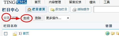 注意:由于本系统采用了html纯静态生成技术(好处多多),你可能在修改资料或新增资料的时候,见不到效果,在这种情况下,你可以回到栏目中心”,按照下面的图示,先点全选,再点生成,刷新下你修改的那个栏目或文章就可以了,如果只是想见到修改后的某一篇文章或产品页面有没效果,修改完后,刷新下你的文章或产品页就行,文章或产品页在修改后就已经自动生成了。